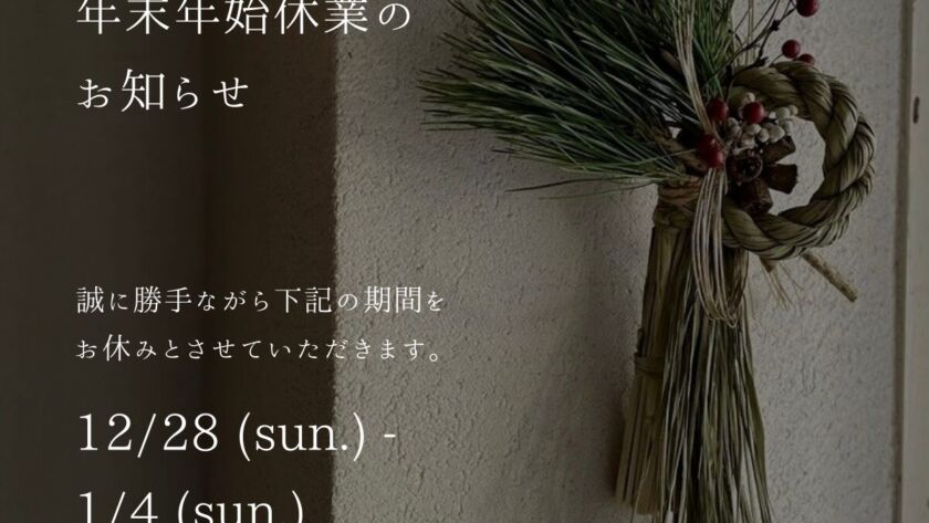 令和5年12月30日(土)~令和6年1月4日(木)まで年末年始休業とさせていただきます。 令和6年1月5日(金)から通常営業となります。 本年も残りわずかとなりました。お体に気を付けて良い年末をお過ごしください。 また、新年も変わらぬご愛顧をいただけますようよろしくお願い申し上げます。