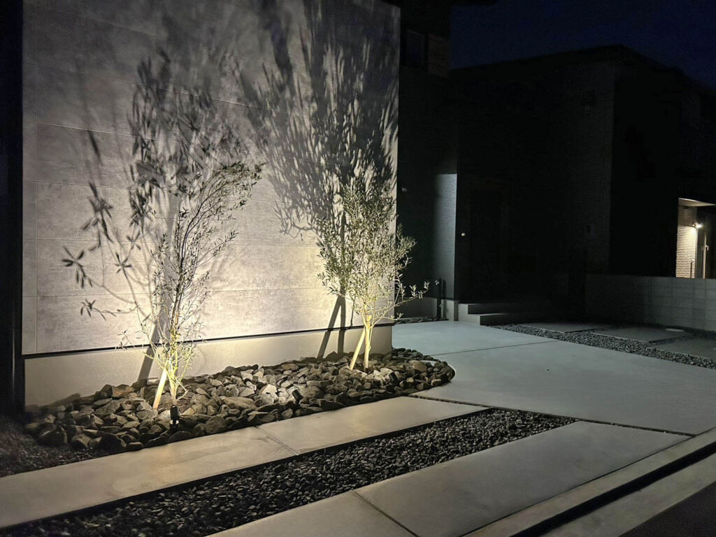 夜には幻想的に、昼には洗練された佇まいで。時間の移ろいとともに、異なる魅力を見せてくれる外構空間です。