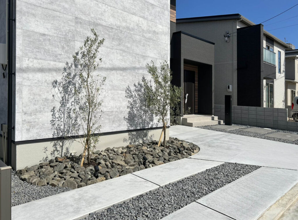 玄関へと続くアプローチには、洗い出しコンクリートと砂利を組み合わせ、シンプルながら表情豊かな仕上がりに。植栽スペースは曲線でやわらかく区切られ、オリーブの木が日常に彩を添えます。